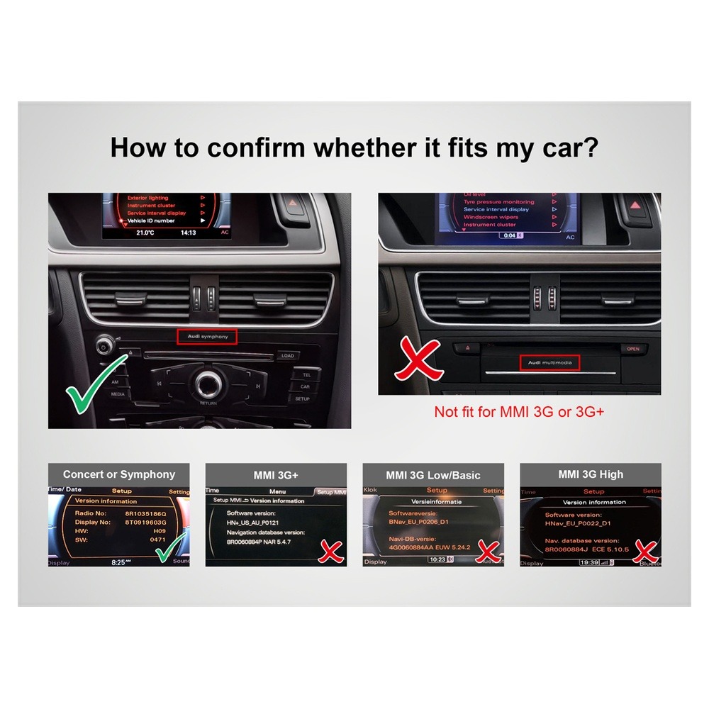 | 2008-2015 | Audi | Q5 | OEM radio: AUDI MMI 3G+/3G High system, 7″ monitor, 4-pin LVDS connector. AUDI MMI 3G Basic/Low, 6.5″ monitor, 4-pin LVDS connector. |